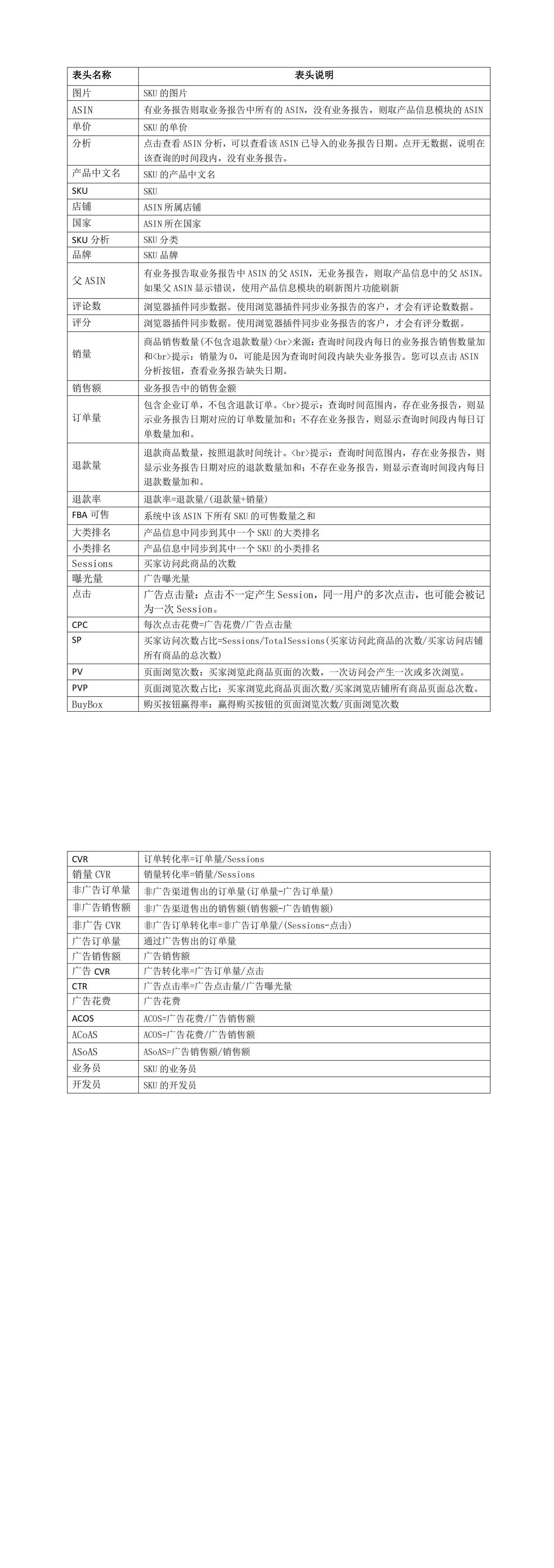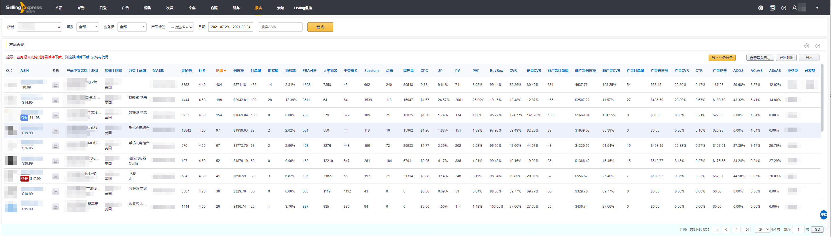 根據您查詢的日期范圍和已導入的業務報告日期,我們將為您展示ASIN的產品名稱、SKU、店鋪、國家、分類、品牌、父ASIN、評分、評論數、銷量、銷售額、訂單量、退款量、退款率、FBA可售、大類排名、小類排名、買家訪問次數(Sessions)、廣告點擊量(click)、廣告曝光量、廣告每次點擊花費(CPC)、買家訪問次數占比(SP)、頁面瀏覽次數(PV)、頁面瀏覽次數占比(PVP)、購買按鈕贏得率(BuyBox)、訂單轉化率(CVR)、銷量轉化率(銷量CVR)、非廣告訂單量、非廣告銷售額、非廣告轉化率(非廣告CVR)、廣告訂單量、廣告銷售額、廣告轉化率(廣告CVR)、廣告點擊率(CTR)、廣告花費(cost)、廣告花費在廣告銷售額中占比(ACOS)、廣告花費在總銷售額中占比(ACoAS)、廣告銷售額在總銷售額中占比(ASoAS)、業務員、開發員等數據,您可以根據自己的需求,自定義顯示您希望展示的數據。