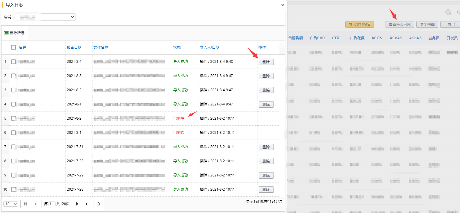 5、通過查看導入日志功能,可以查看店鋪的業務報告導入情況。