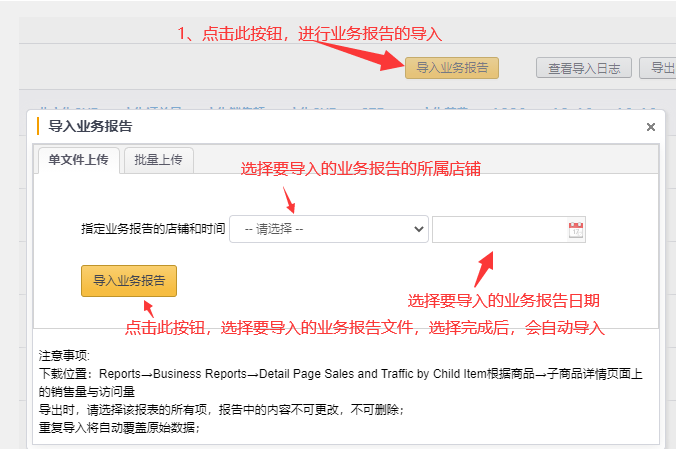 進入“報表→產品表現”頁面,點擊列表右上角的“導入業務報告”按鈕,在彈出的窗口中→1)選擇店鋪→2)選擇日期→3)選擇文件。